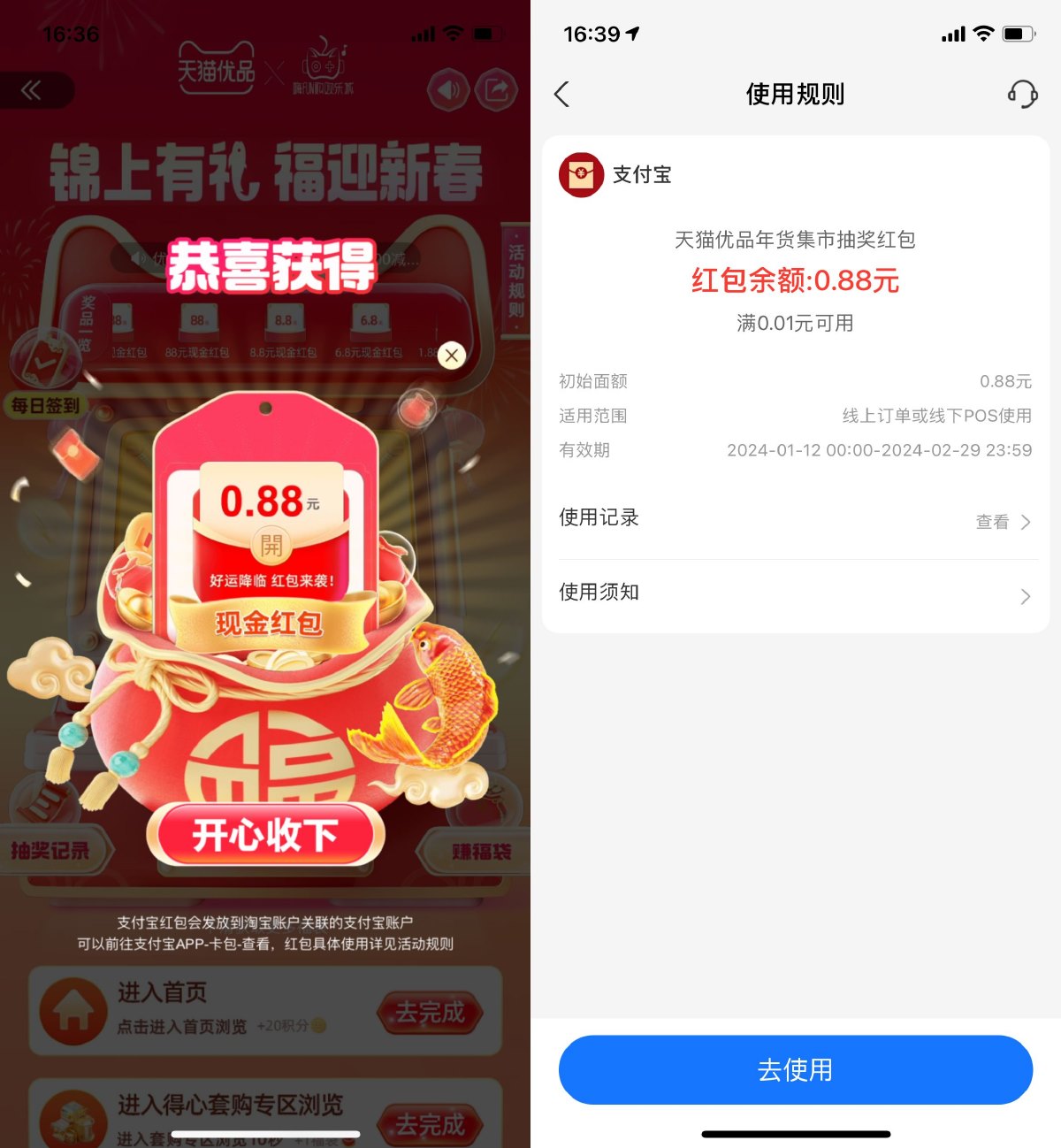 淘宝APP扫码->简单浏览得福袋->抽0.88~888亓通用购物红包,在支付宝卡包中查看