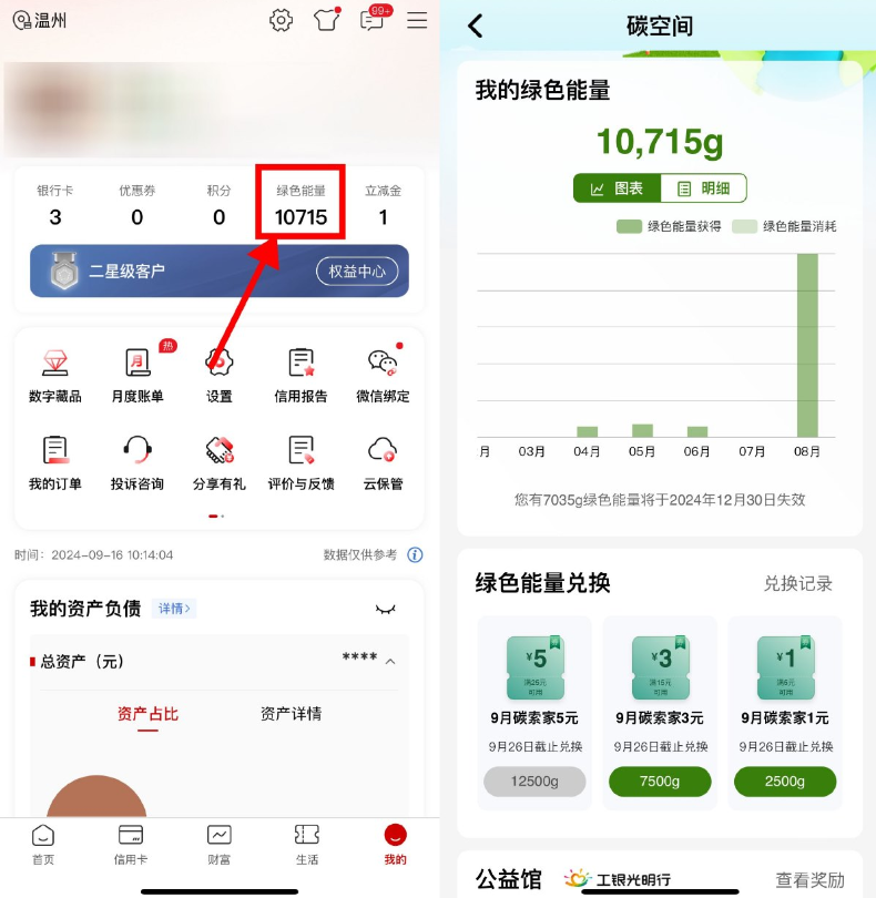 工行APP底部“我的”->绿色能量->根据规则说明完成低碳行为得绿色能量(完成后3个工作日内自动到)->累计能量兑换1~10元微信立减金