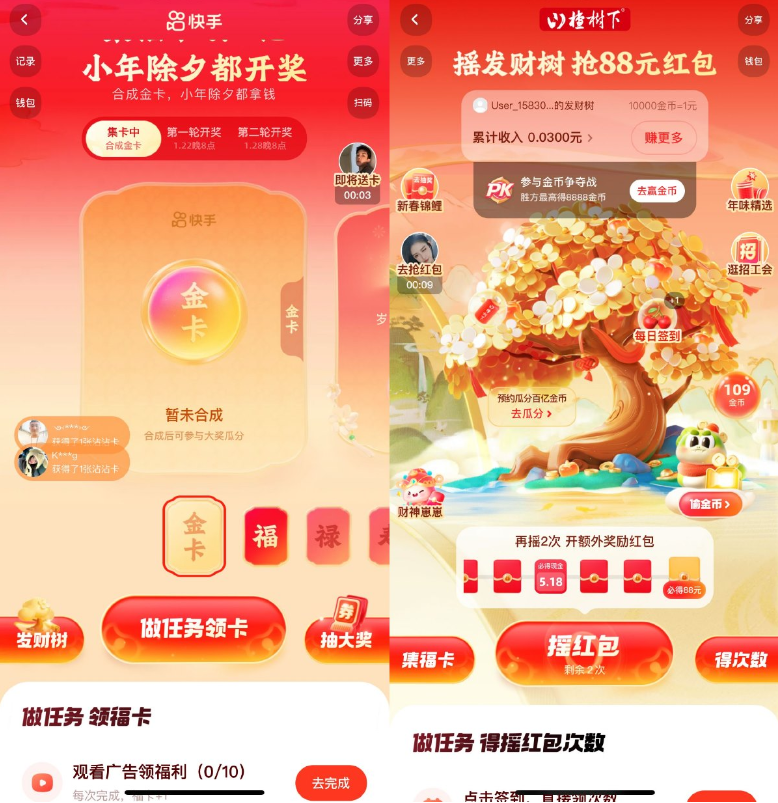 快手搜索“集福卡”进入活动,左侧可切换“集福卡、发财树”共2个活动