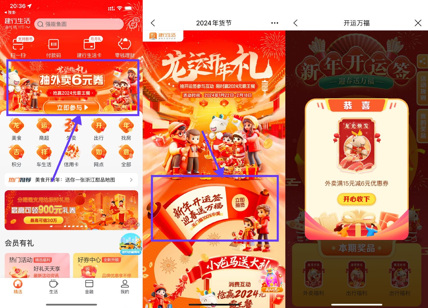 建行生活APP->首页横幅进入->新年开运签->每天摇一摇抽外卖券、打车券等奖励
