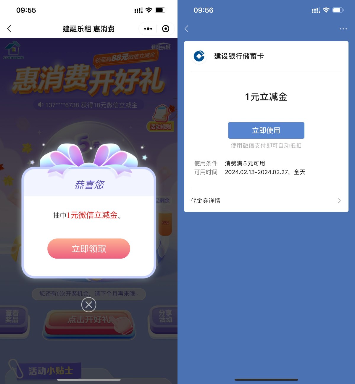 微信进入小程序“CCB建融家园”->惠消费开好礼->直接抽微信立减金->跳转到建行小程序领取秒到