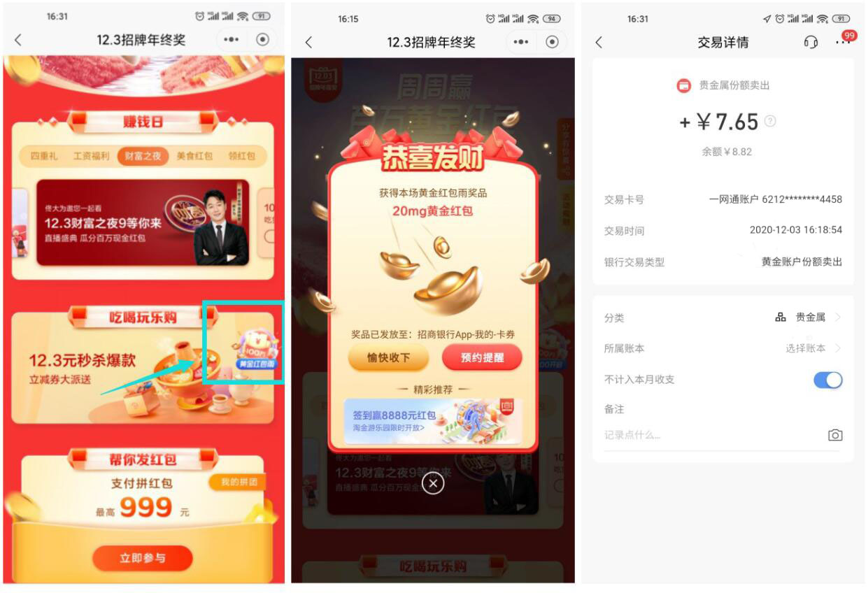 2、活动3点十点红包雨->中了黄金的去卡券里使用->然后搜索黄金->点持仓->卖出即可!