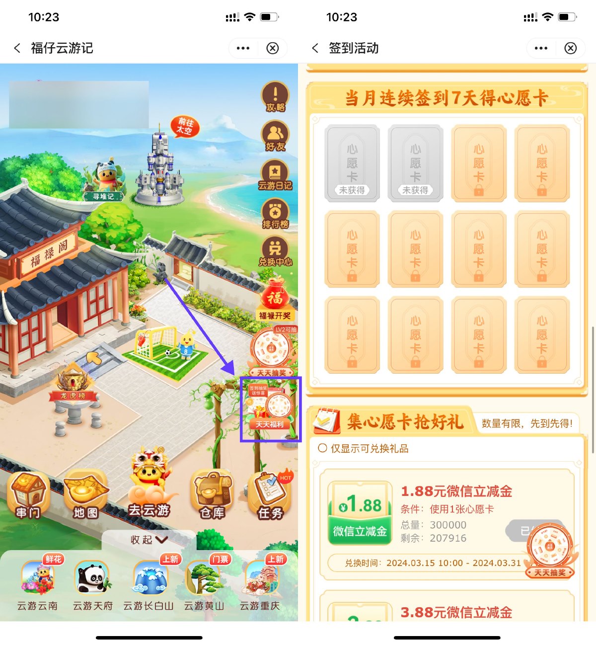 中行APP搜索“福仔云游记”->右侧“天天福利”->每连续签到7天得1张心愿卡->在4月15日10点之后即可兑换1.88~5.88亓立减金