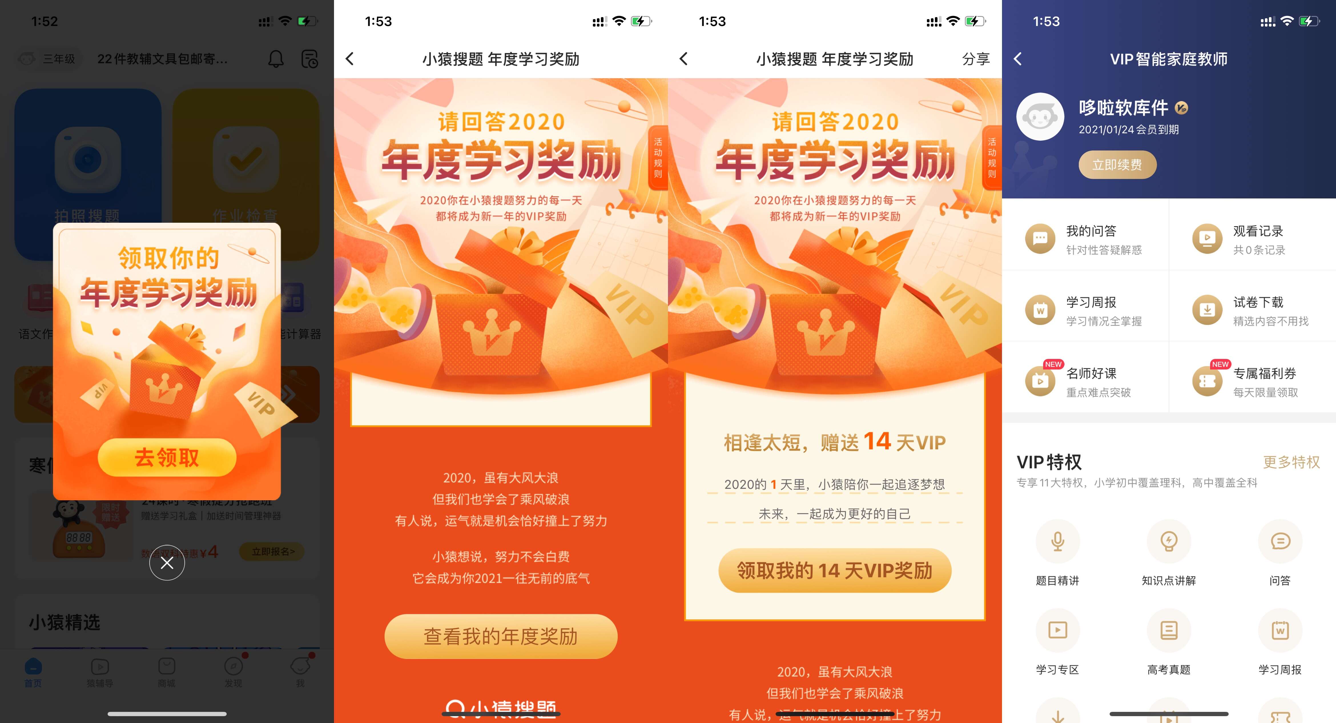 下载小猿搜题APP->首页->年度学习奖励->查看我的年度奖励领取->然后分享还可以获得10天秒到!