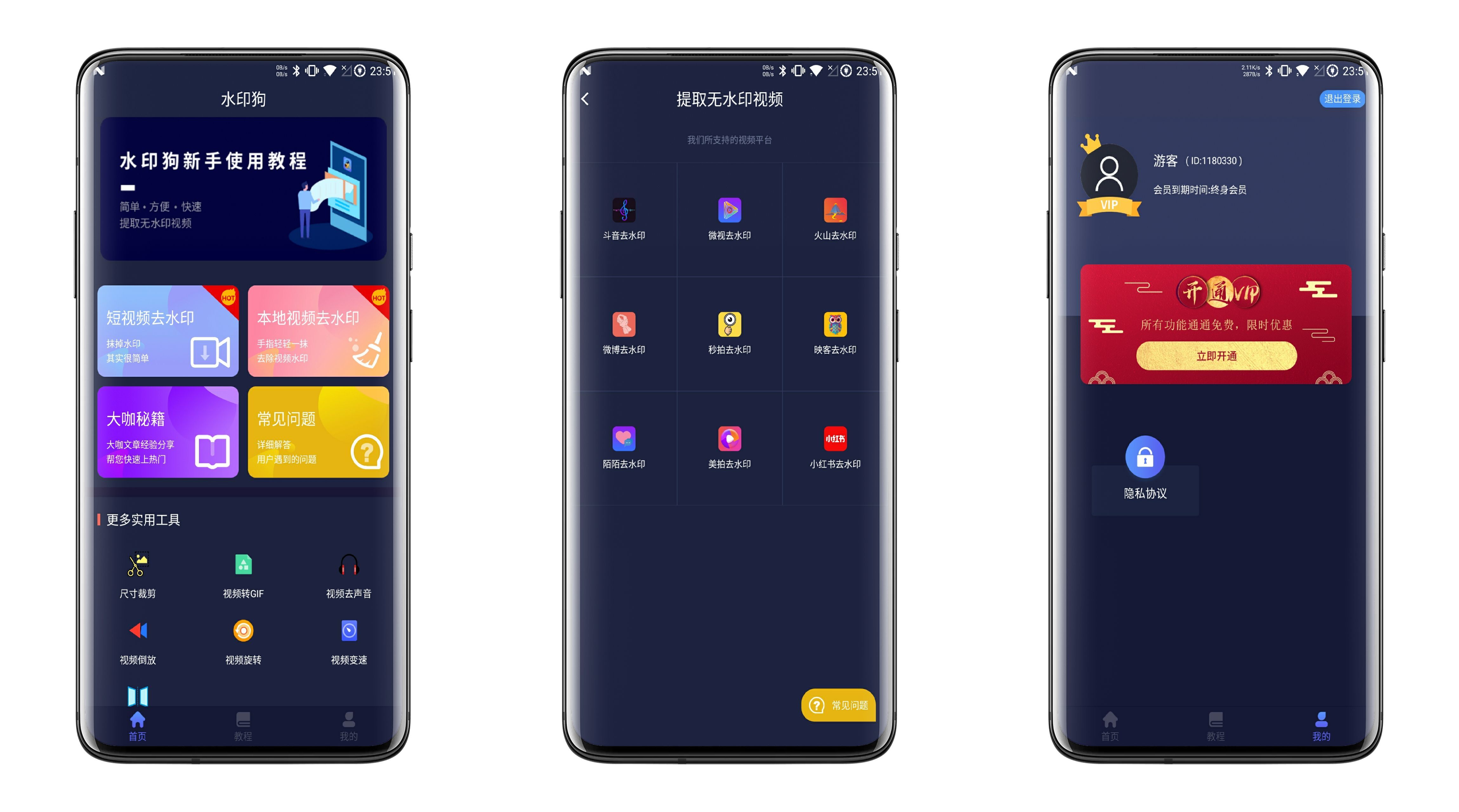 相信有很多人在找视频素材的时候都被水印烦到,那么这时可以试试水印狗app,这是一款十分强大的视频去水印软件,通过它不仅可以帮助用户轻松的帮助用户将本地视频进行去水印,还提供了短视频下载智能去水印功能,也就是说支持用户直接将抖音、微视、火山、微博、秒拍等平台的视频链接复制进行接着解析下载,接着在下载的同时系统会智能帮助用户去除其中的logo水印,从而即可更快速的帮助用户获取到自己想要的内容,并无需手动去水印,十分方便。另外,在水印狗中除了强大的去水印功能,还提供了视频去声、背景音乐添加去除、视频倒放、视频变速、视频转GIF、视频镜像等等功能,非常的丰富,可以很好的满足用户们的视频制作使用需求。已经破J会员限制,内置游客身份登陆就是终身会员!(游客登录即是会员)