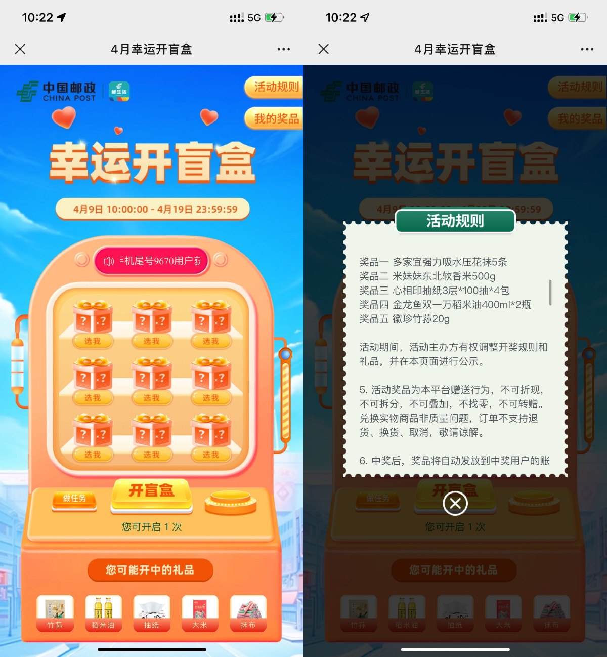 活动地址:https://youshenghuo.11185.cn/wx/#/luckyOpenBlindBoxTemplateH5?activityId=100808&activityType=HD