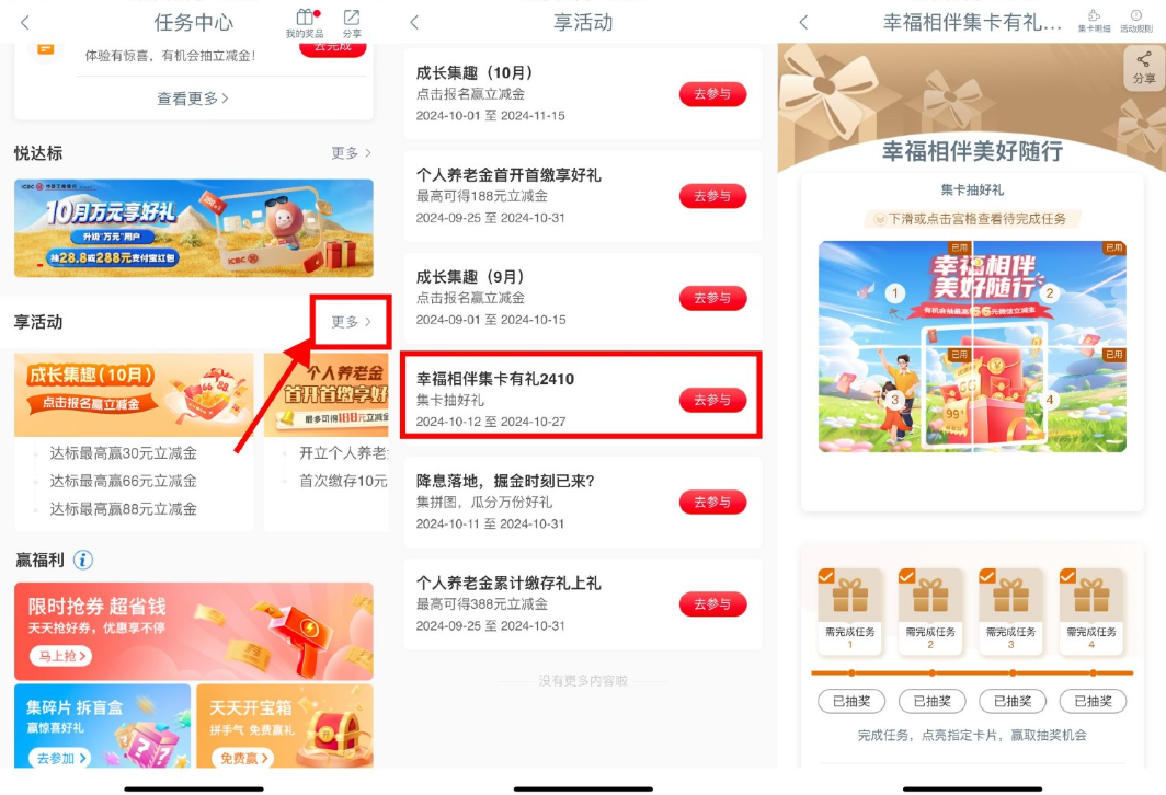工行APP搜索“任务中心”->享活动“更多”->幸福相伴集卡有礼->简单浏览集卡抽5~20亓立减金
