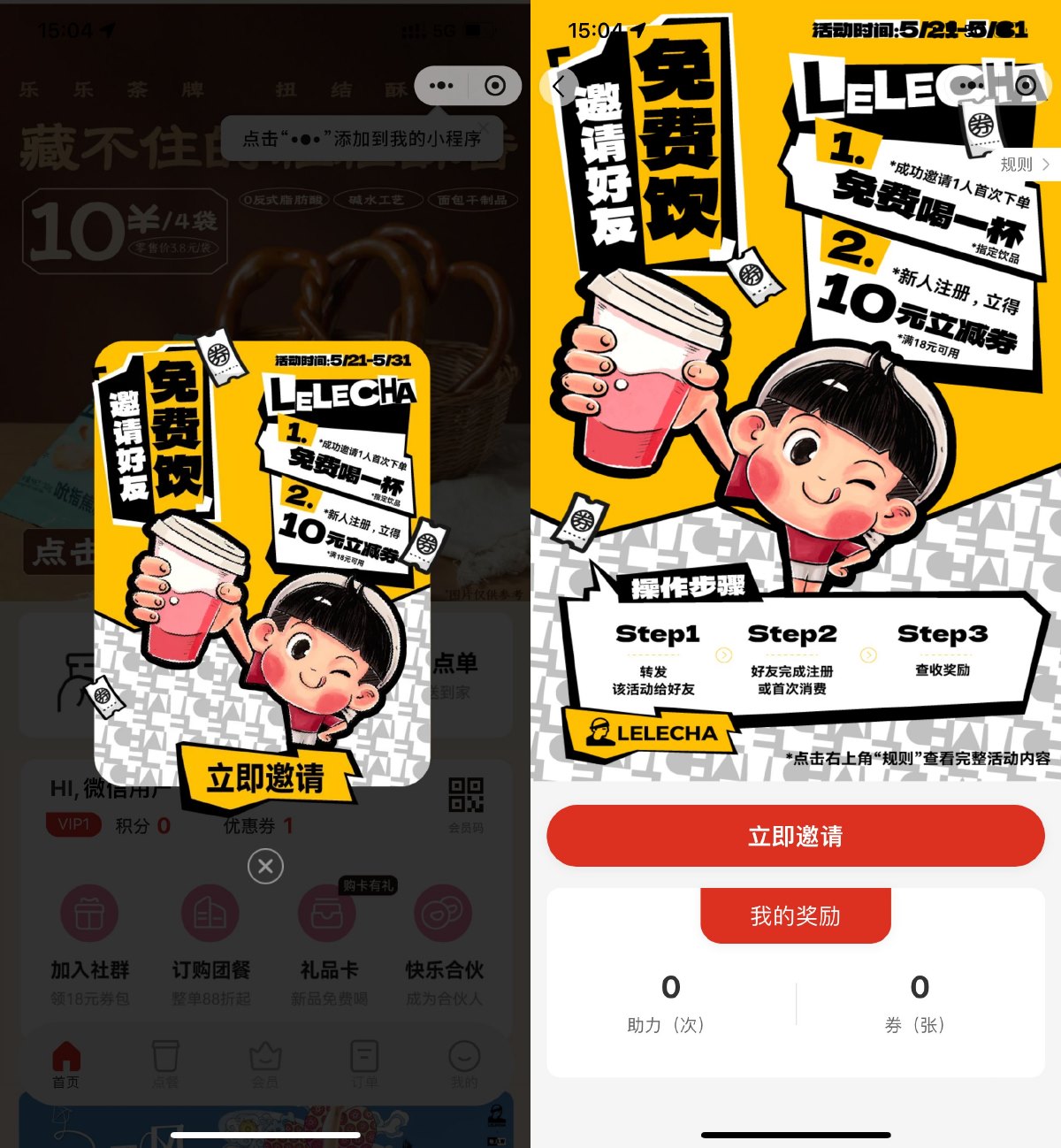 微信进入#小程序:乐乐茶点单 ->邀请好友下单可得免单券,好友可得18-10亓券,刚兴趣的去参与!
