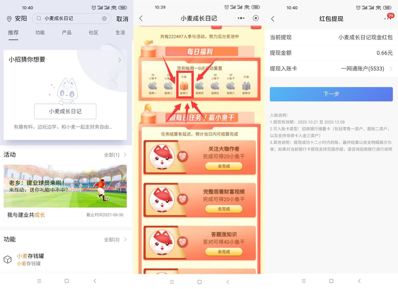 招商银行APP搜索“小麦成长日记”->点搜索进入->下拉页面点礼盒->星期天->获得红包后去我的卡券提现!