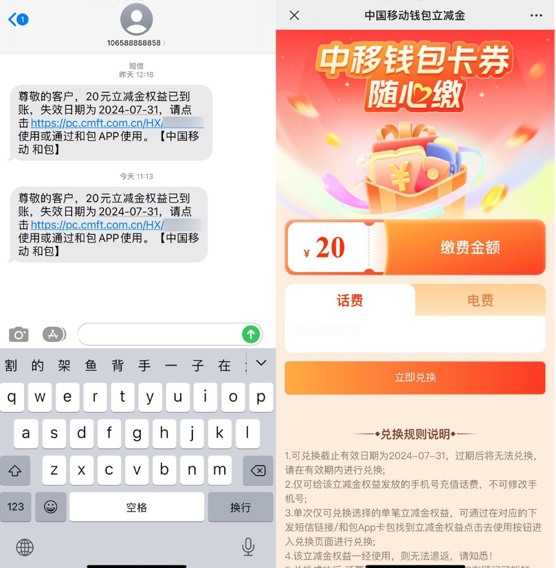 移动用户注册过和包的,看看自己有没有图1的短信,有的话进入直接领20亓话费