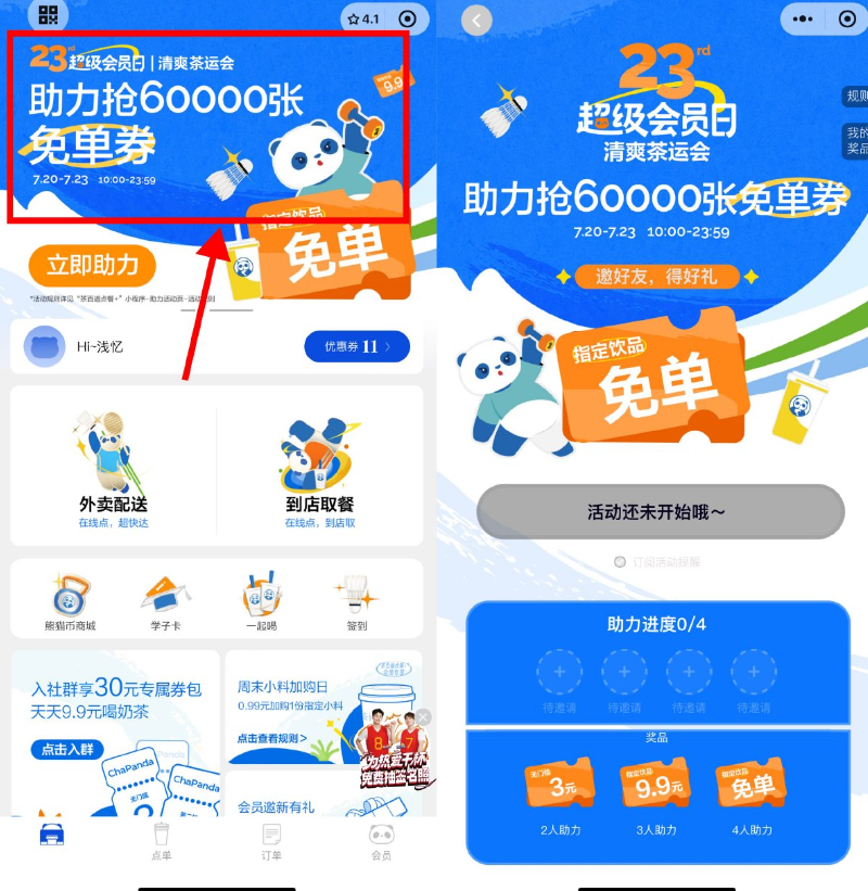 微信进入#小程序:茶百道点餐+ ->点轮播图进入->邀请4人助力可得免单券,今天限量1万张