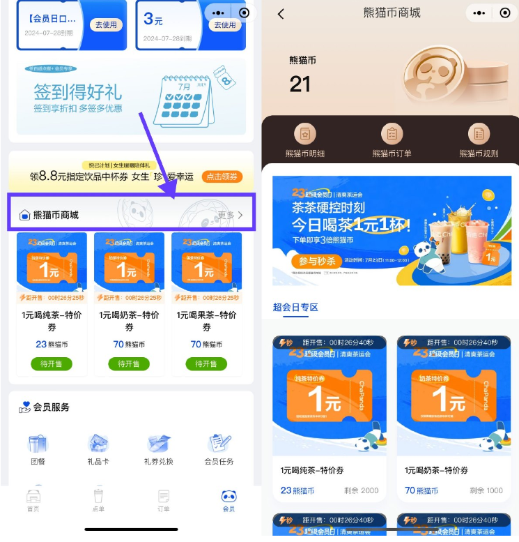 微信进入#小程序:茶百道点餐+ ->我的->熊猫币商城->11点开始使用23熊猫币兑后1亓饮品券