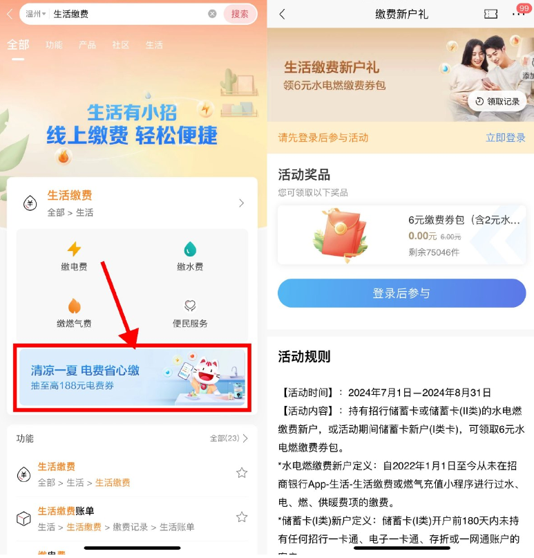 招行搜索“生活缴费”->横幅“清凉一夏”->生活缴费新用户直接领2张3亓券,每个月可用一张券