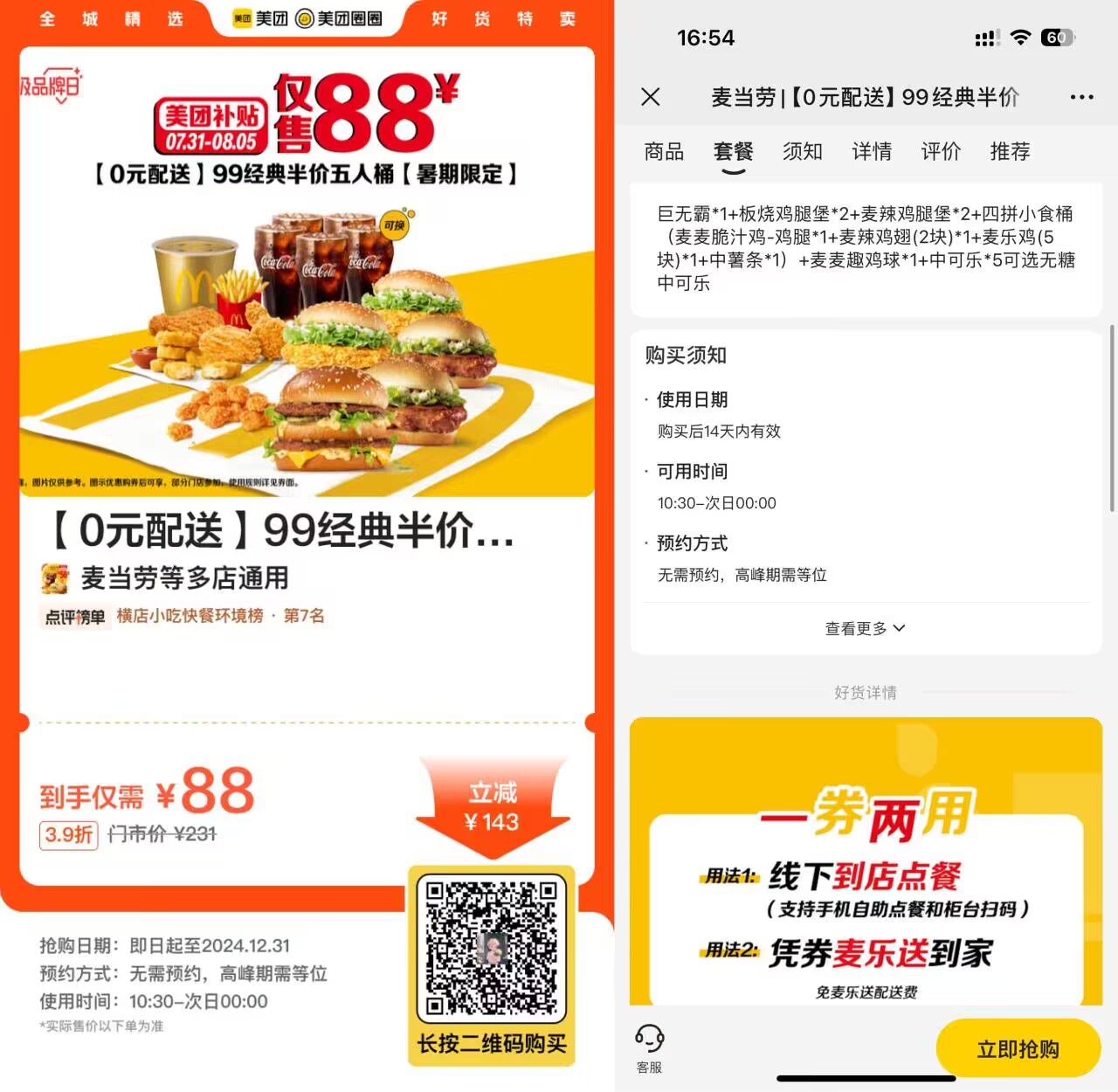 麦当劳88亓半价购5人经典桶