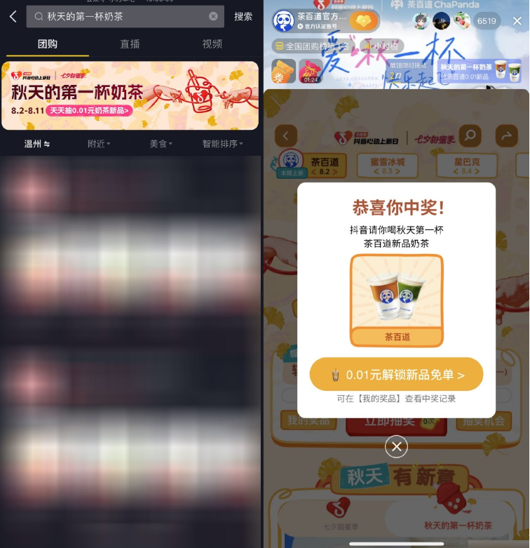 抖音APP顶部“团购”->搜索“秋天的第一杯奶茶”->8月2日~11日每天抽各大品牌奶茶免单券