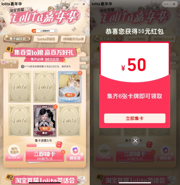 淘宝搜索“lo娘嘉年华”->每天简单浏览得欧气值,每100欧气值可抽一次卡,集齐6张卡可得50亓红包(同一张卡片集齐10张可兑换2亓红包)