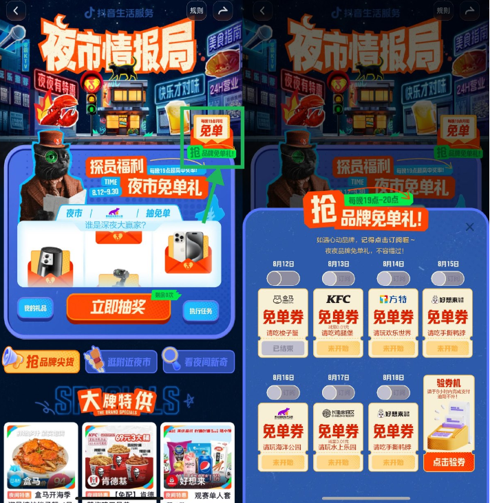 抖音APP搜索“夜市情报局”->每天19点整抢品牌免单券,可0.01亓买大牌实物或门票