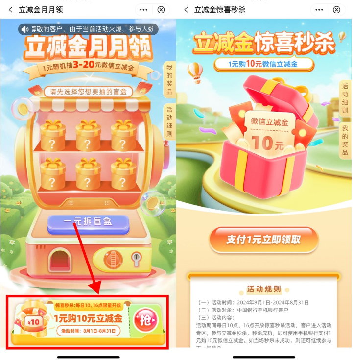 中行APP搜索“立减金”->进入后下拉点横幅进入->每天10/16点每个整点抢500份50减10亓立减金