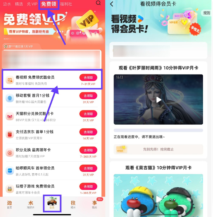 优酷底部“会员”->顶部“免费领”->找到看视频那个进入,看10分钟领优酷会员月卡