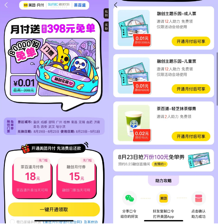 美团首开月付领茶百道18元券