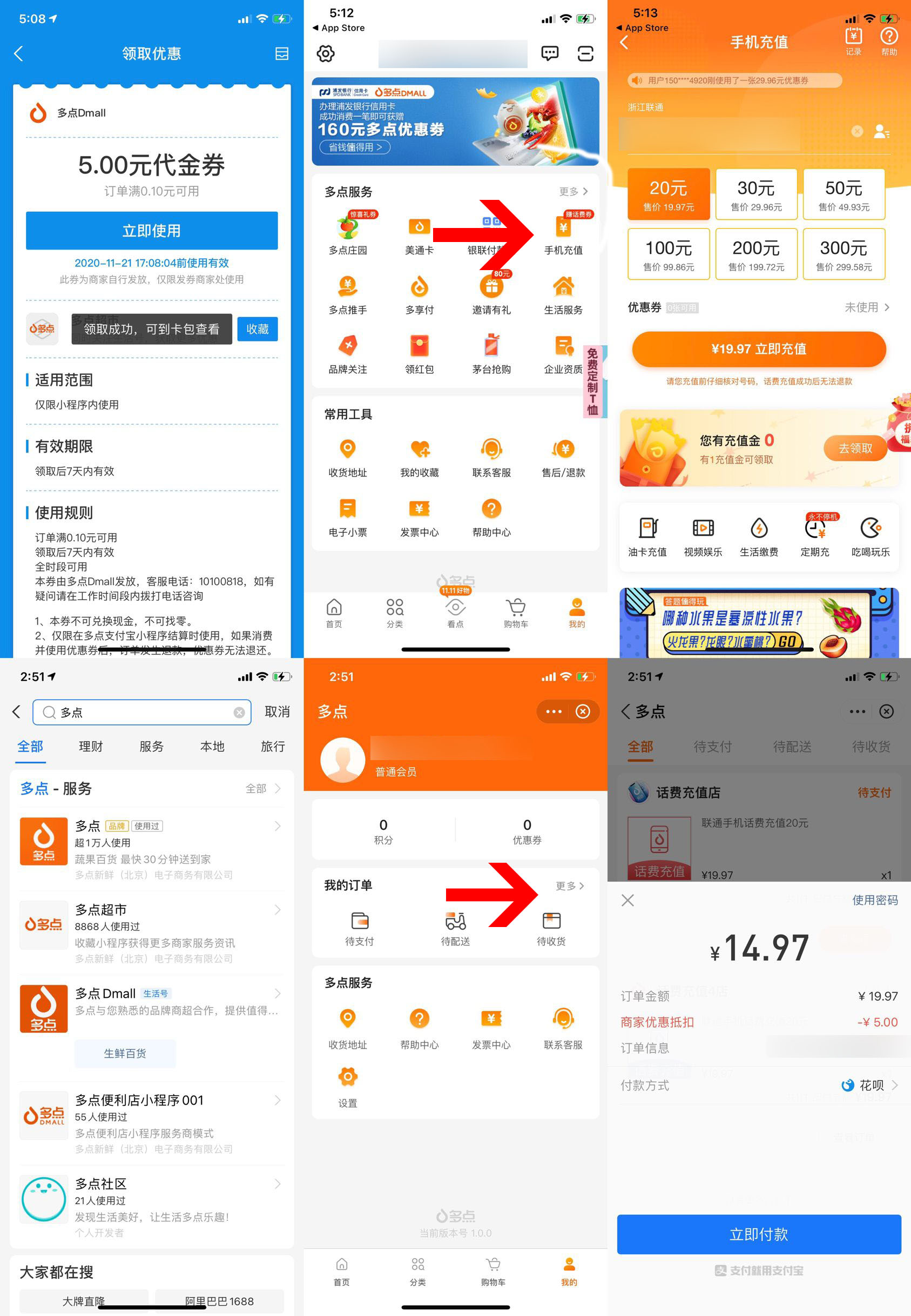 1、支付宝扫码领取5元券->领取成功后下载多点APP->我的->下拉页面->手机充值