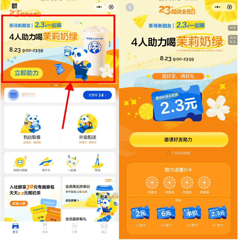 微信进入#小程序:茶百道点餐+ ->点轮播图进入->邀请4人助力可得2.3亓茉莉奶绿券,限量5万张