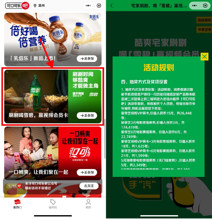 微信进入#小程序:可口可乐吧 ->下拉页面“刷剧喝雪碧”进入->每天2次机会抽爱奇艺或腾讯视频会员