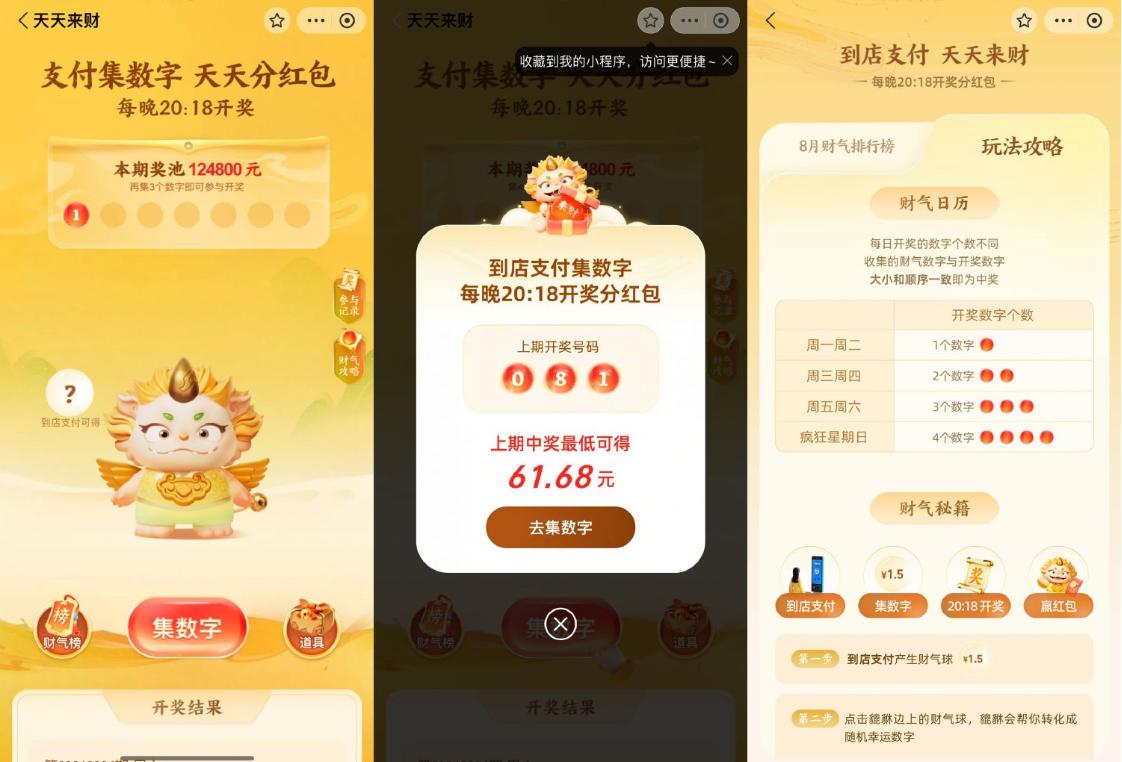 支付宝搜索“天天来财”->每天到店支付可得财气球->每晚20点18分大小和顺序都对可得红包