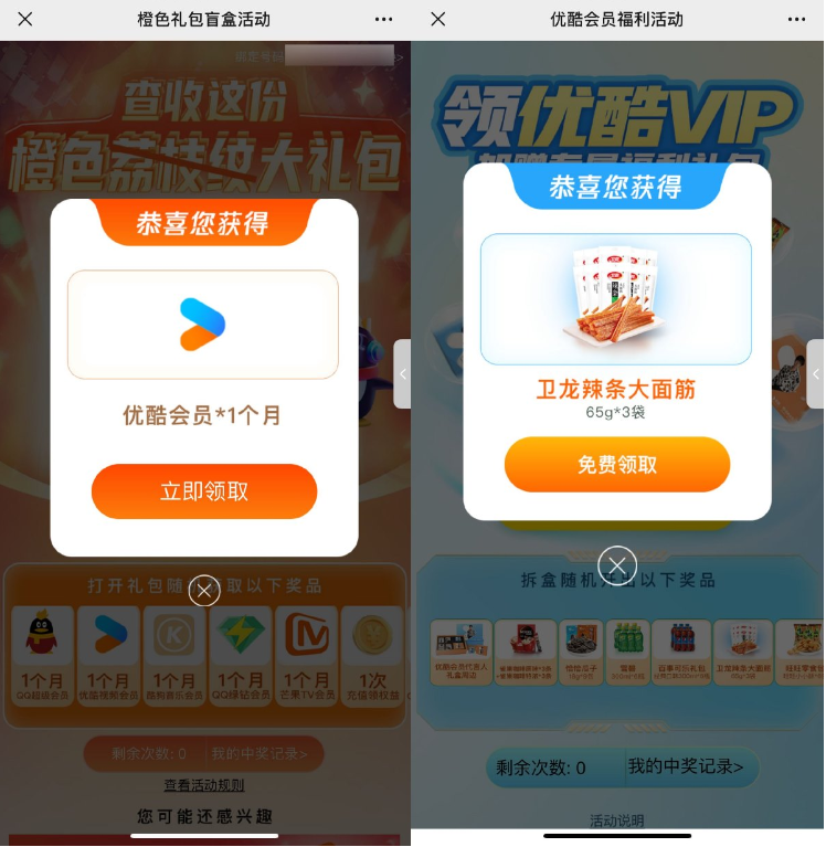 有点绕 自己琢磨,活动1没中优酷会员的话 就兑换不了活动2的实物