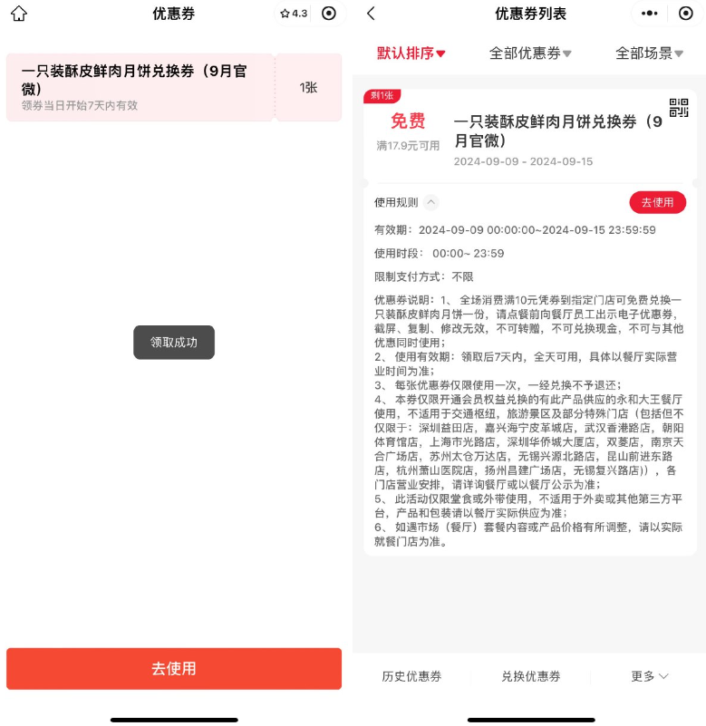 微信打开活动->直接领1只月饼兑换券 限量1万份,需消费满17.9亓才可随单使用