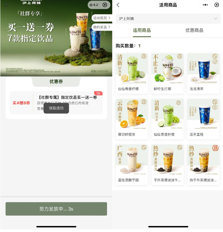 微信打开活动->直接领买一送一券 有7种饮品可用,限量20万张