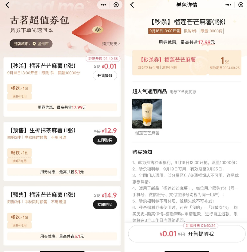 微信打开活动->9月16日~18日每天13点,0.01亓抢榴莲芒芒麻薯饮品券