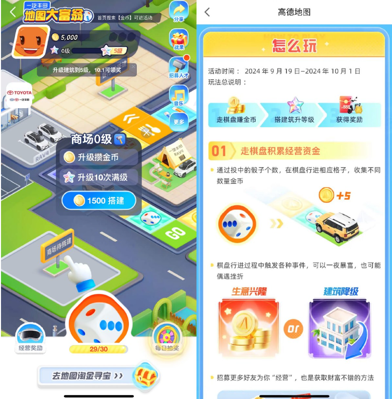 高德地图APP搜索“地图大富翁”->每天简单去玩升级->升到15级~60级在10月1日10点抽奖基本必得实物