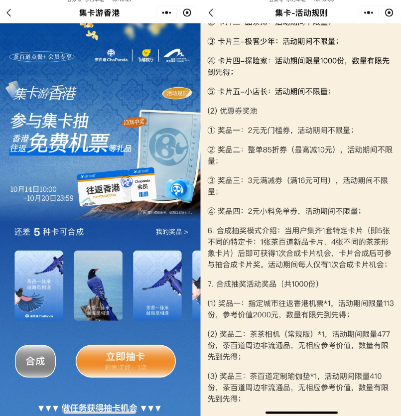 微信打开活动->简单浏览和分享得次数抽卡,集齐5张卡片抽香港机票或实物