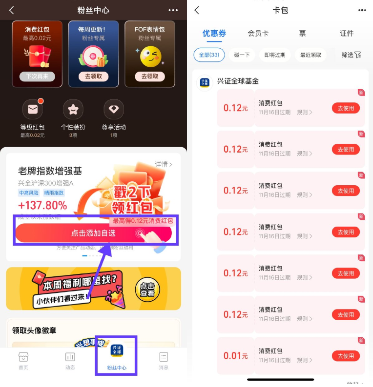 支付宝APP扫码->底部“粉丝中心”->挨个加入自选领消费红包,红包可叠加使用