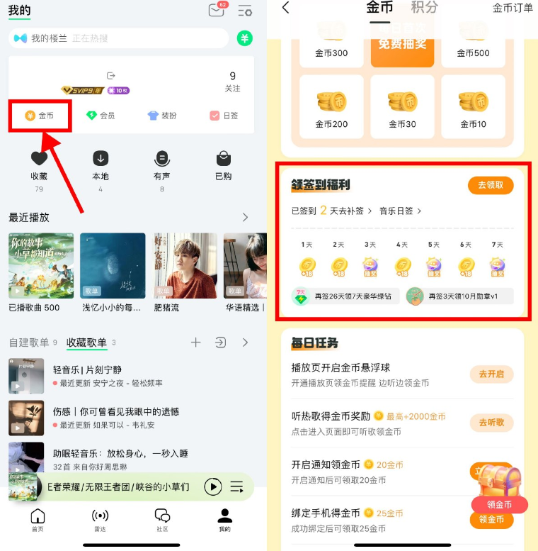 QQ音乐APP底部“我的”->点击“金币”进入->下拉签到28天可领7天绿钻会员