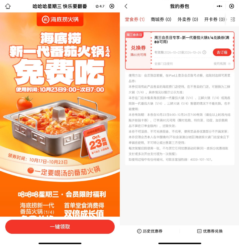 微信打开活动->直接领番茄锅兑换券,限10月23日可用