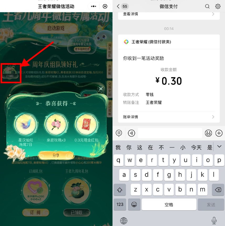 微信打开活动->登陆游戏后返回活动,点左上角悬浮窗直接抽0.3~88.88亓红包