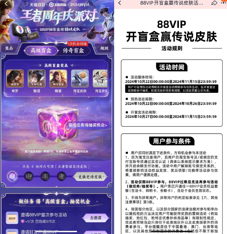 淘宝APP扫码->每天签到、邀请88VIP用户得次数,集齐4个碎片兑换史诗皮肤