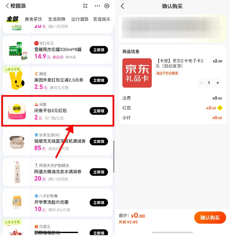 支付宝搜索“校园派”->进入下拉有2亓咸鱼红包,去咸鱼APP随便买啥都能抵扣(可以0亓买2亓京东E卡)