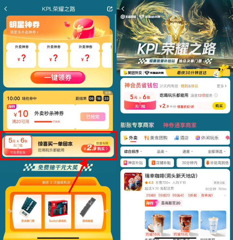 美团APP搜索“KPL”->页面有2.9亓买6张5亓膨胀神券