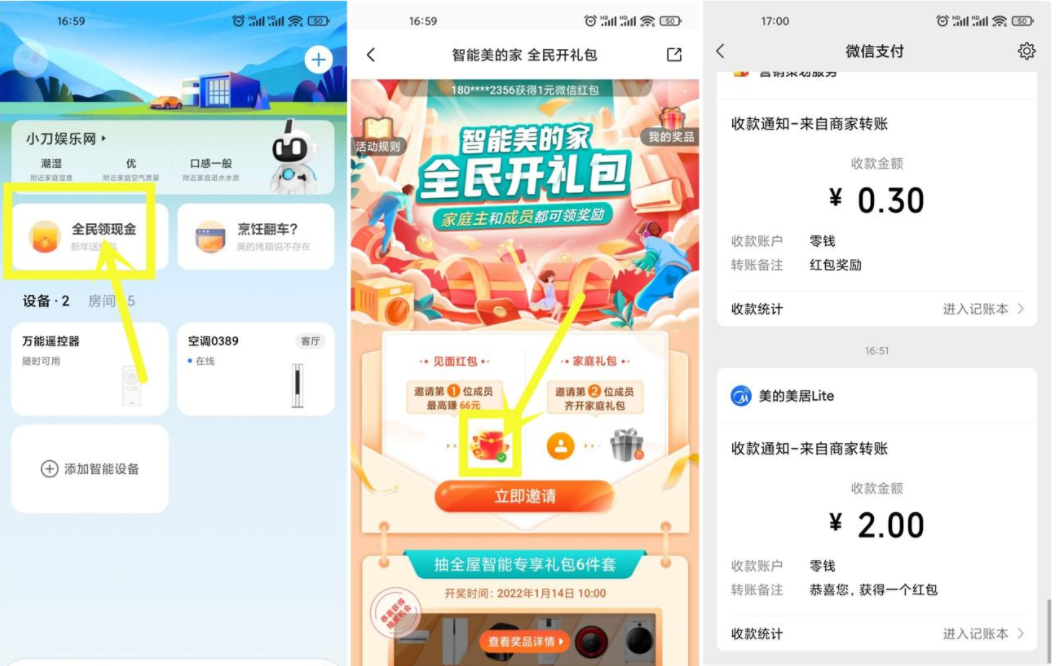 1、打开美的美居APP->首页->全民领现金->进去后分享