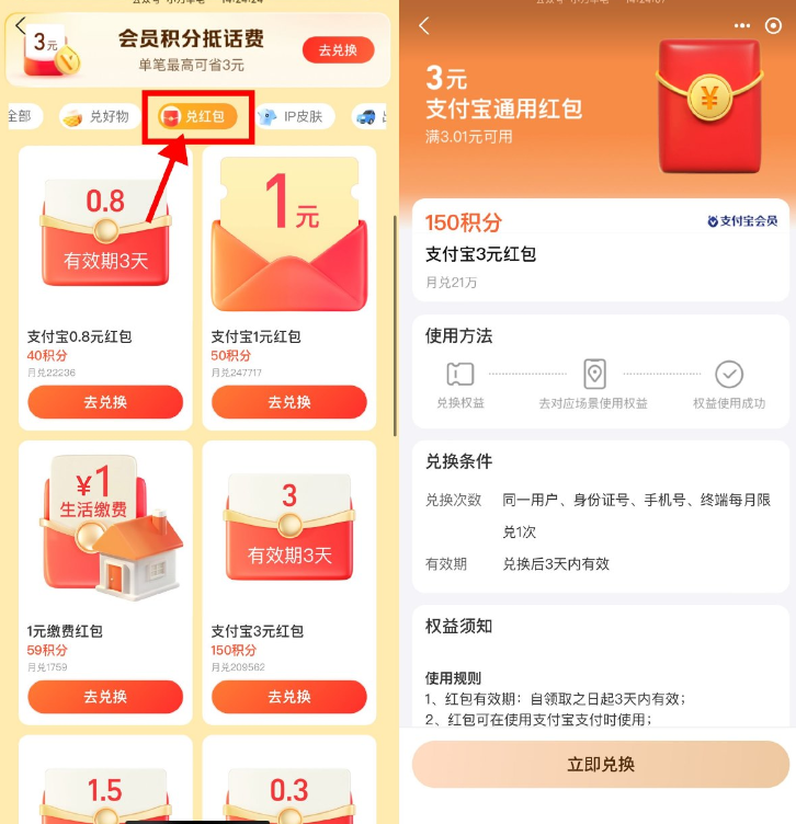 支付宝积分兑换多个通用红包