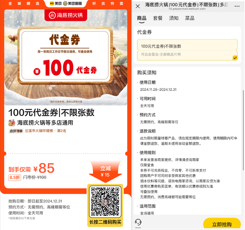 美团海底捞神券来啦!75亓代海底捞火锅100亓券,可无限叠加使用!爱吃速囤~一号4单!全国可用