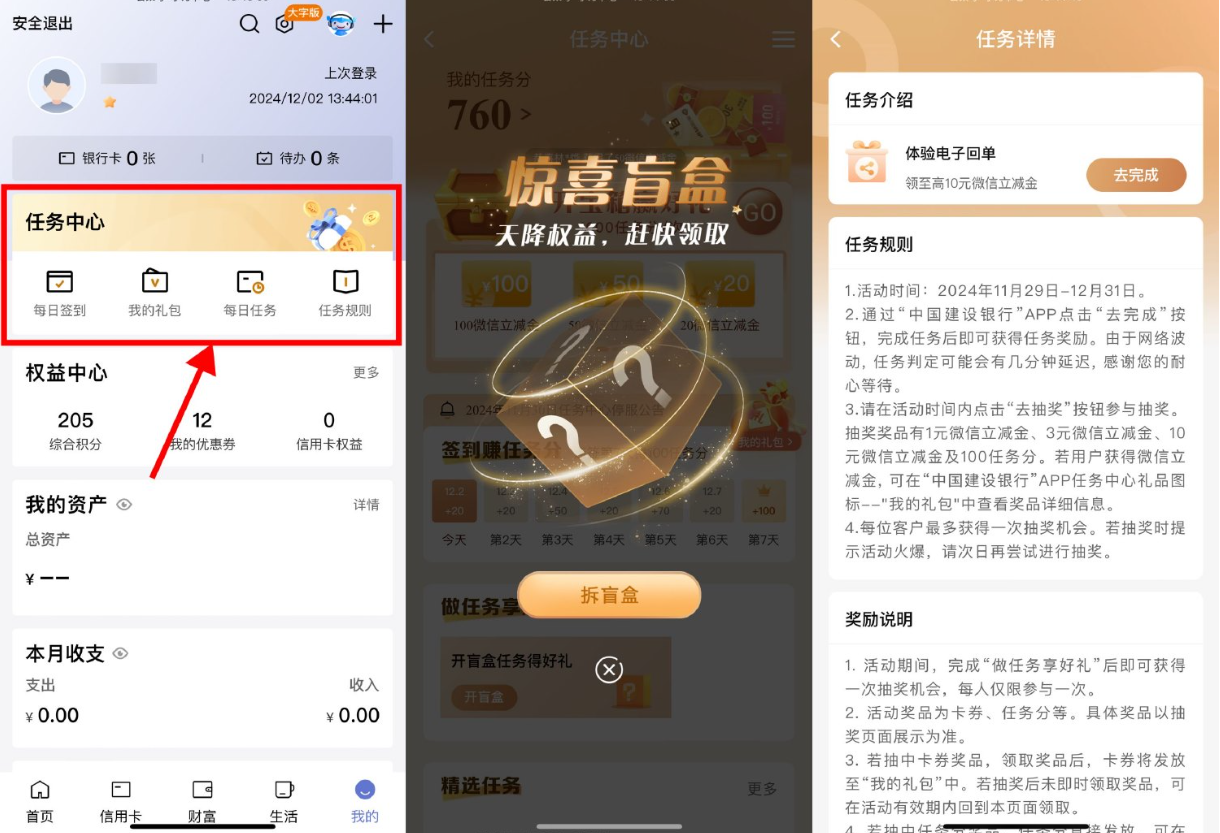 建行APP底部“我的”->会员中心->自动弹出惊喜盲盒,简单浏览抽1~10亓立减金