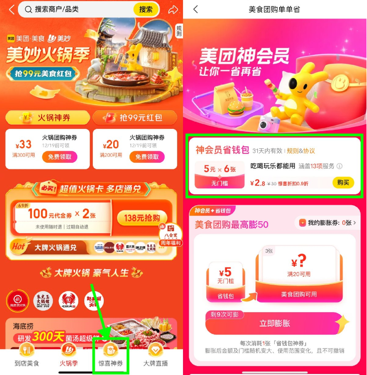 美团APP搜索“美妙火锅季”->底部“惊喜神券”->页面有2.8亓买6张5亓膨胀神券