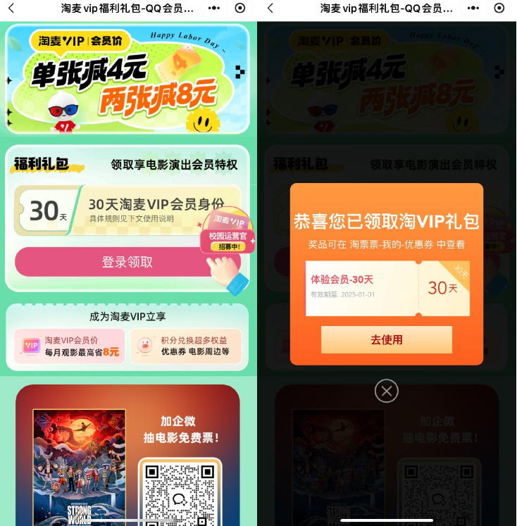 微信打开活动->直接领30天会员,买电影票可减4亓