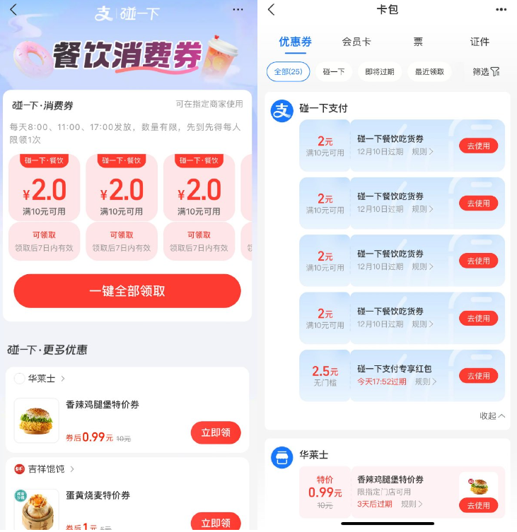 支付宝APP扫码->直接领5张10减2亓消费券,仅限碰一下餐饮类消费可用