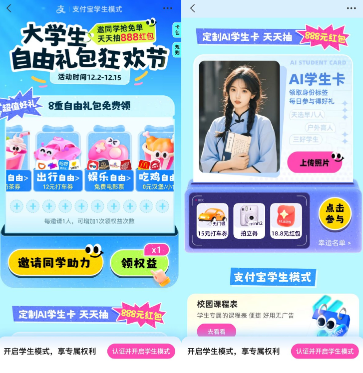 支付宝搜索“学生模式”->学生可领权益券包,下拉每天还能抽支付红包或实物等