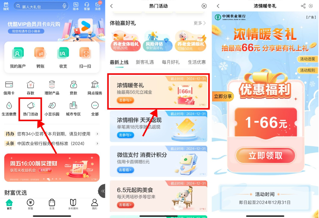 农行APP首页“热门活动”->浓情暖冬礼->直接抽1~66亓支付立减金,在农行APP买东西 或 冲水电话费即可抵扣